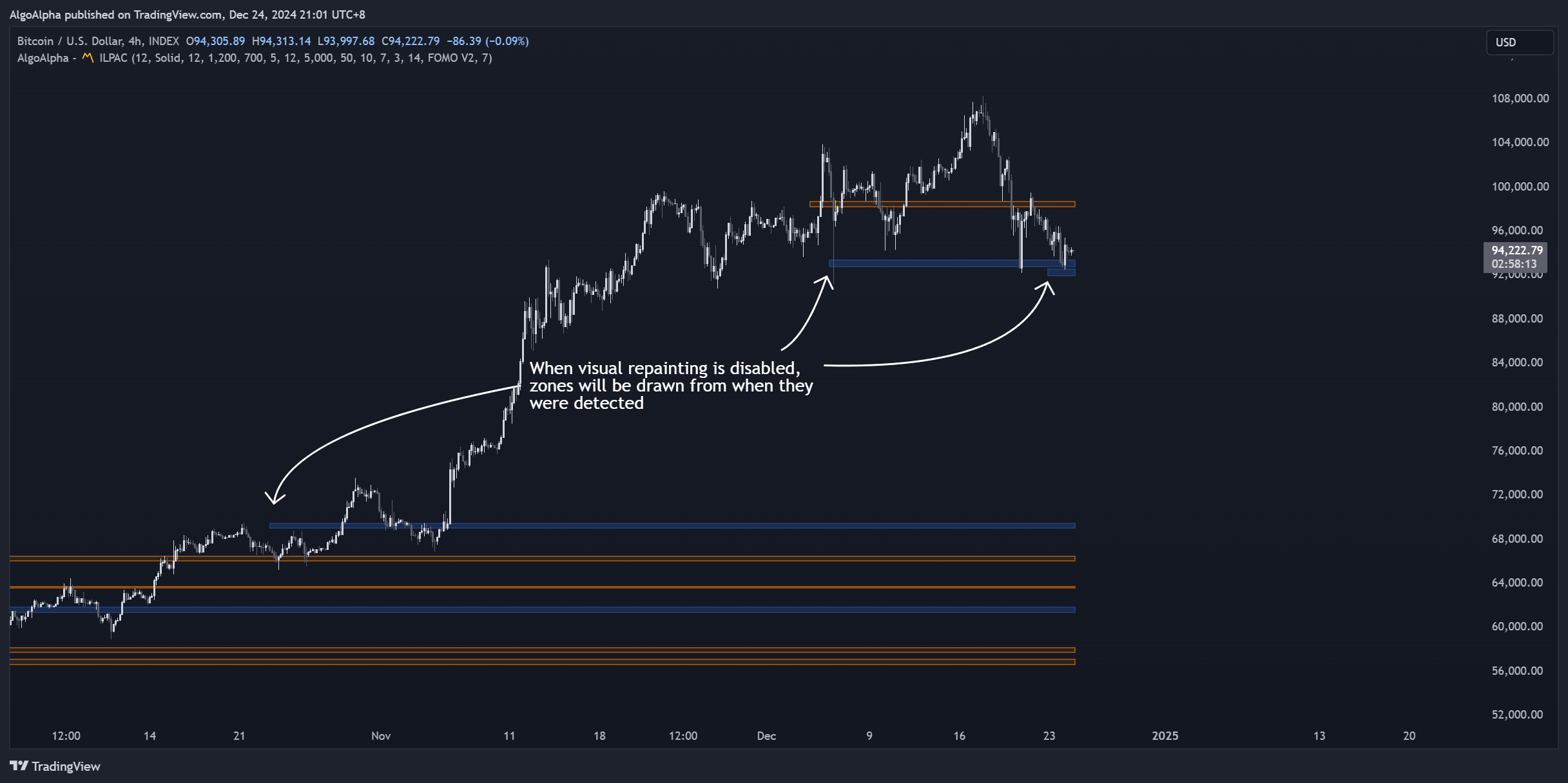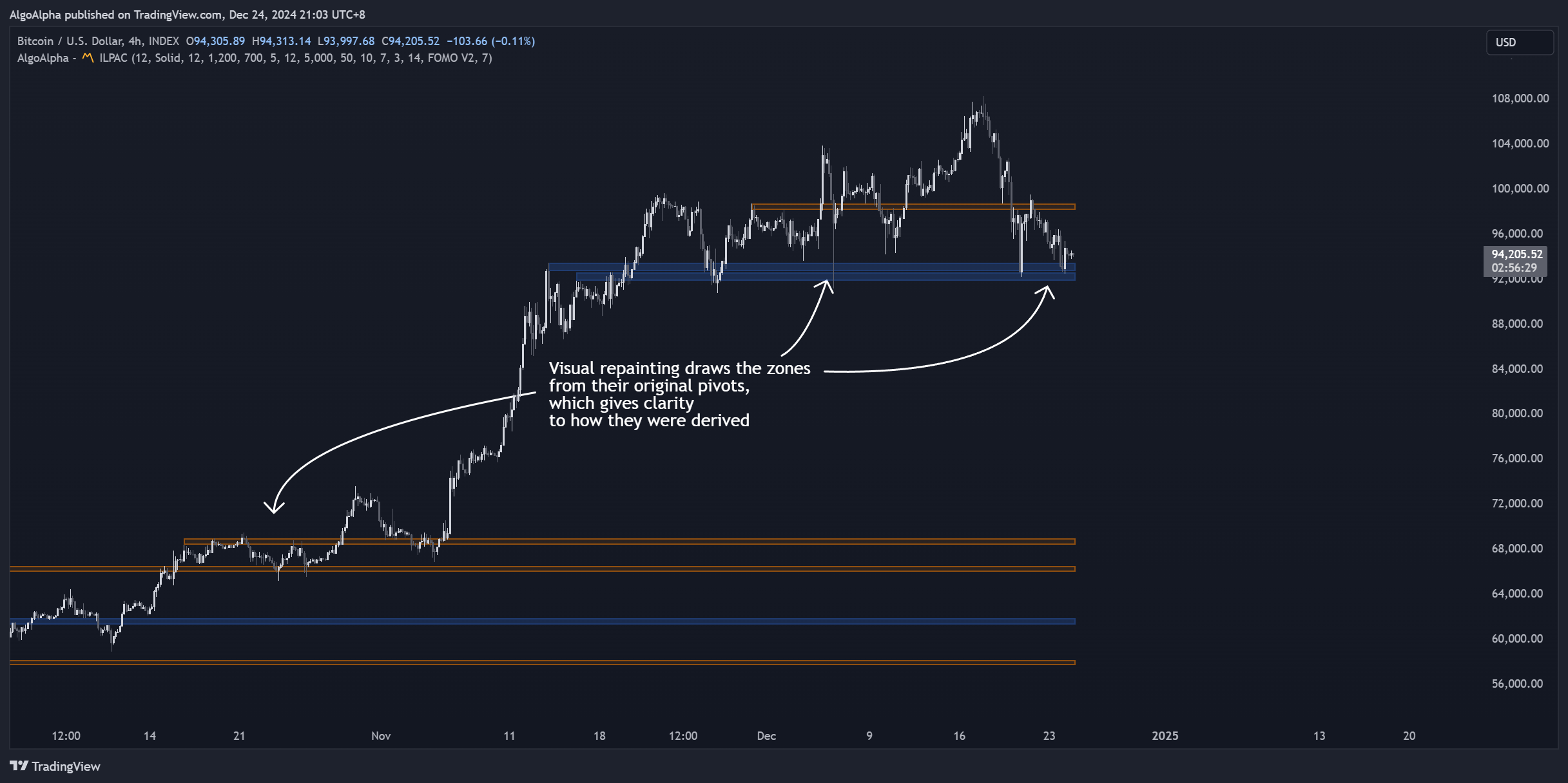 The component automatically identifies significant price levels where reversals or consolidations have occurred, eliminating the need for manual analysis. By analyzing historical pivot highs and lows, the indicator draws zones that traders can rely on for key price action insights.